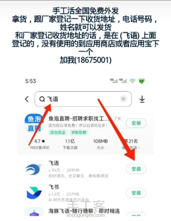 手工活全国各地大量外发,不收取任何押金和材料费全国包邮,送货上门,有想做的朋友,到应用商店搜索下载一个 飞语 注册上去,加入企业一下在搜索加我 我的ID:18675001