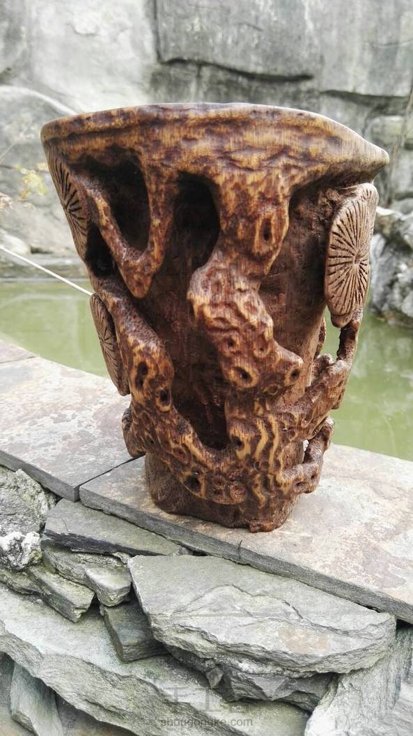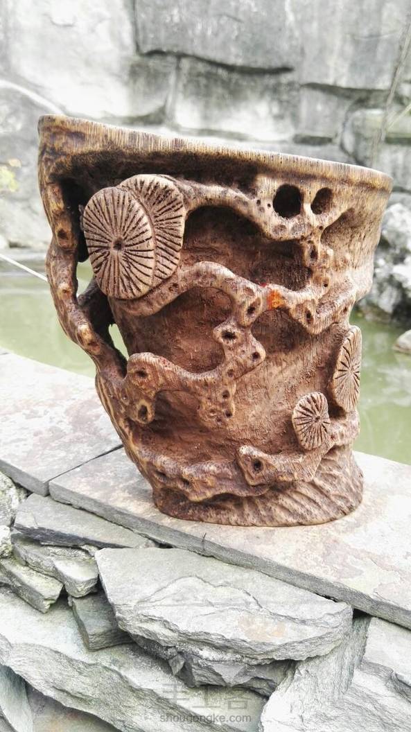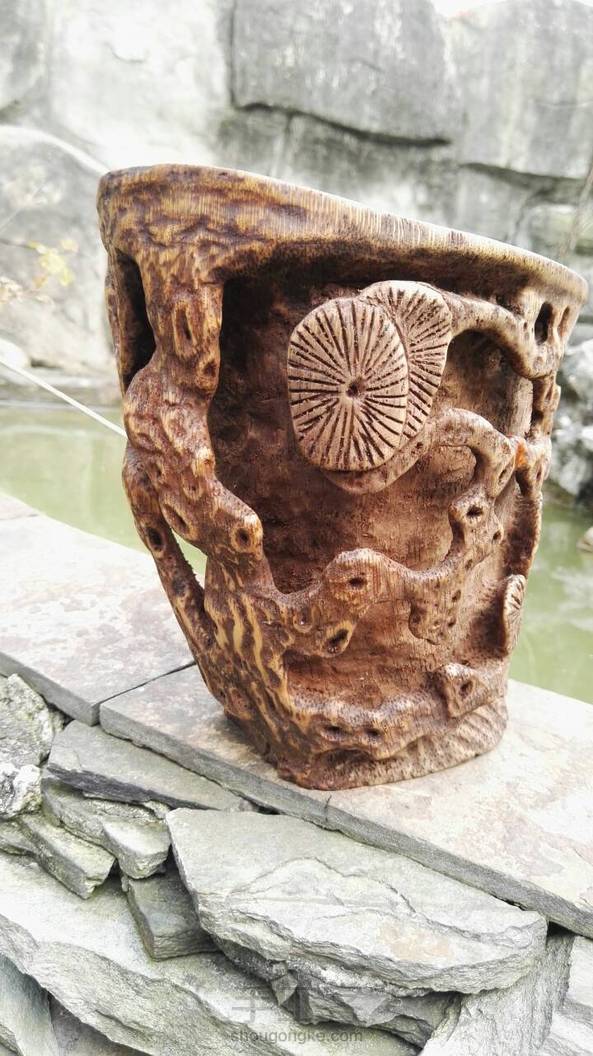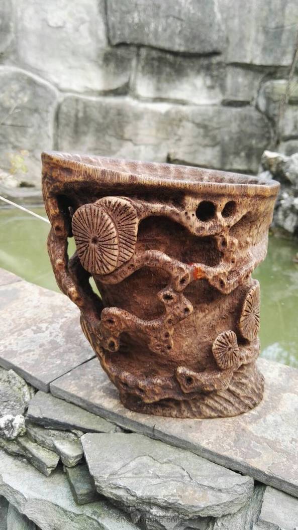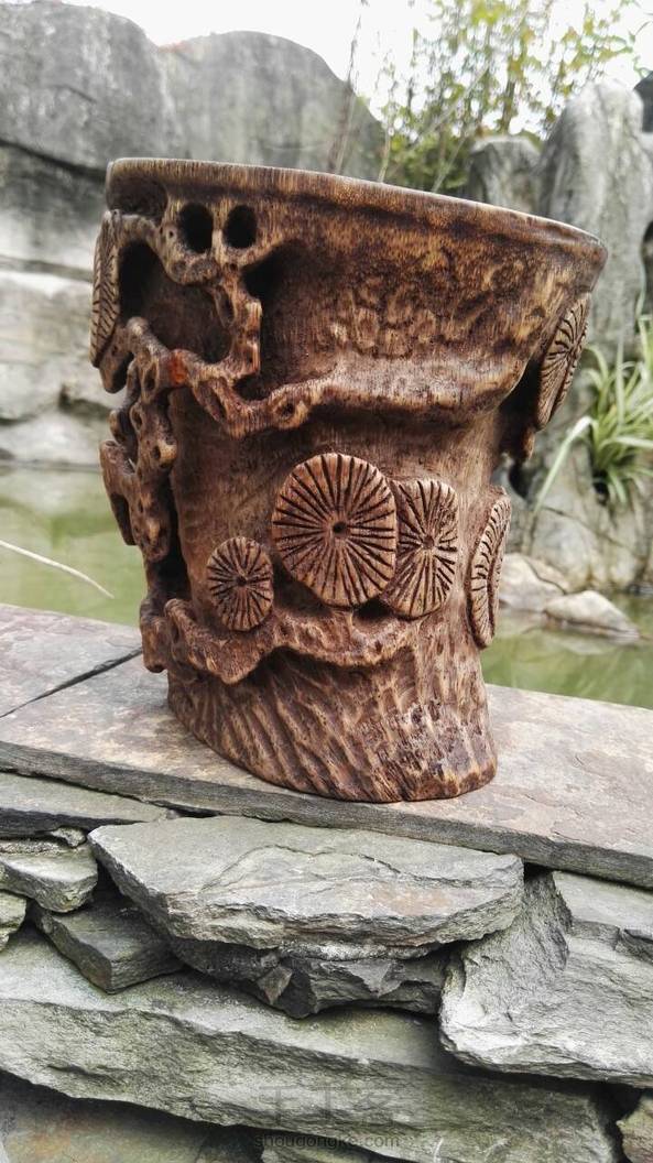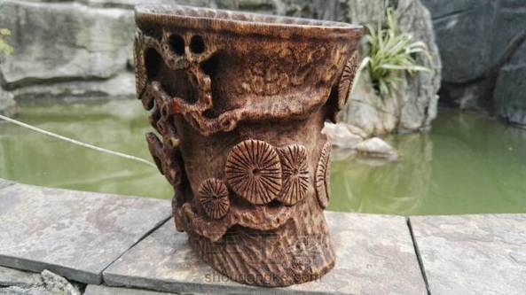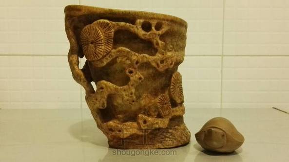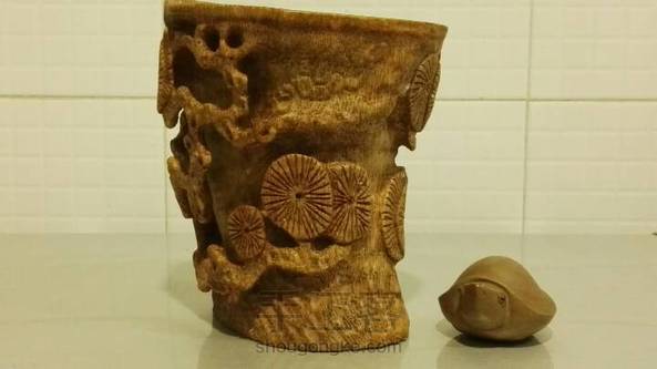 竹根古松杯。试用天然方法试做旧,惜色稍深了些。