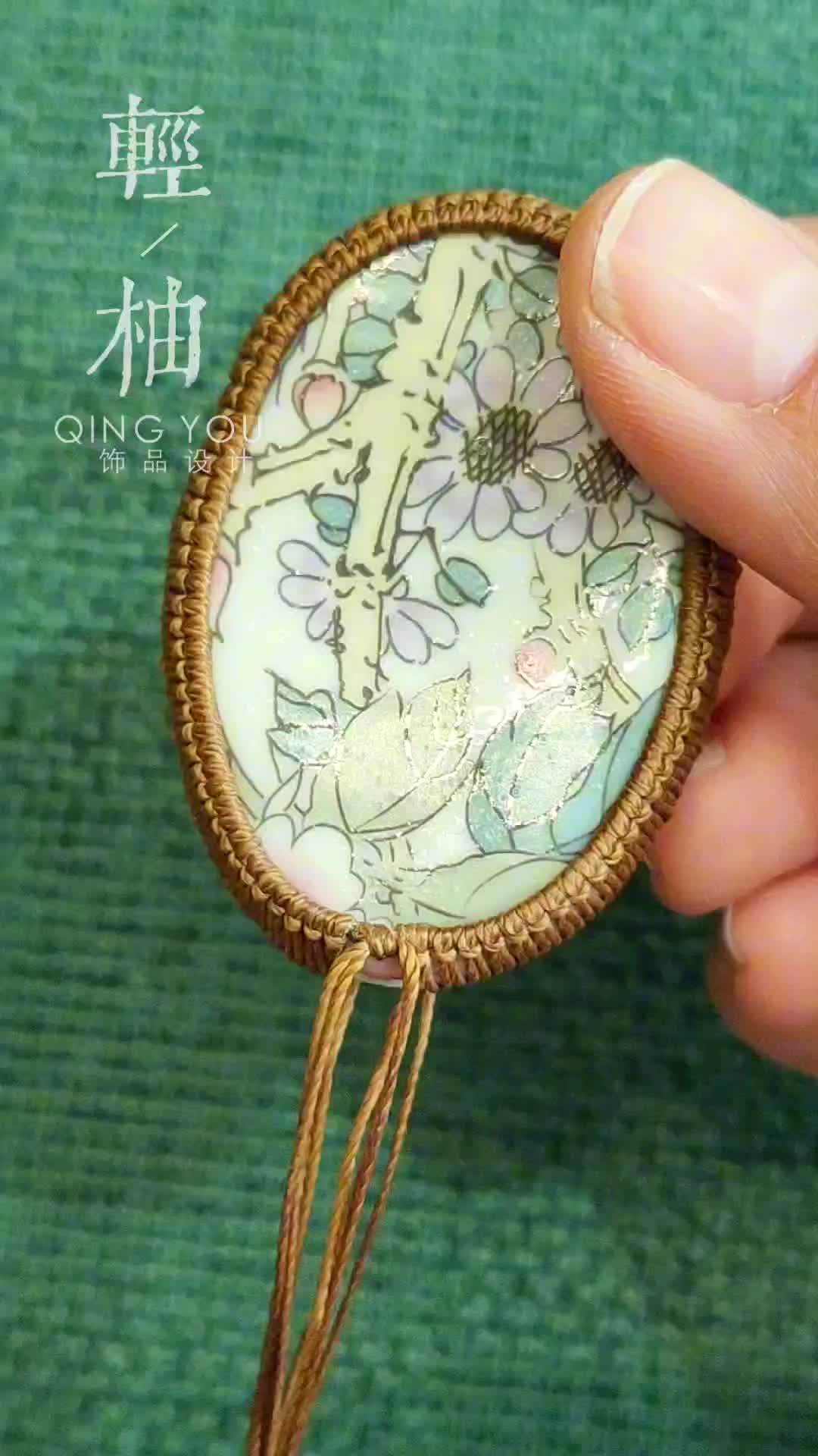 这是挂件的制作记录,适合有编绳基础的学员参考制作。这款挂件根据瓷片的图案和大小设计的款式,将macrame和传统中国结相结合,塑造出儒雅古风感。瓷片图案为繁花似锦,用单色蜡线编制简约造型,以衬托图案的美感。链绳部分加入中国结元素,并在底部挂上流苏,编制出国风挂件,可作车挂、包挂。