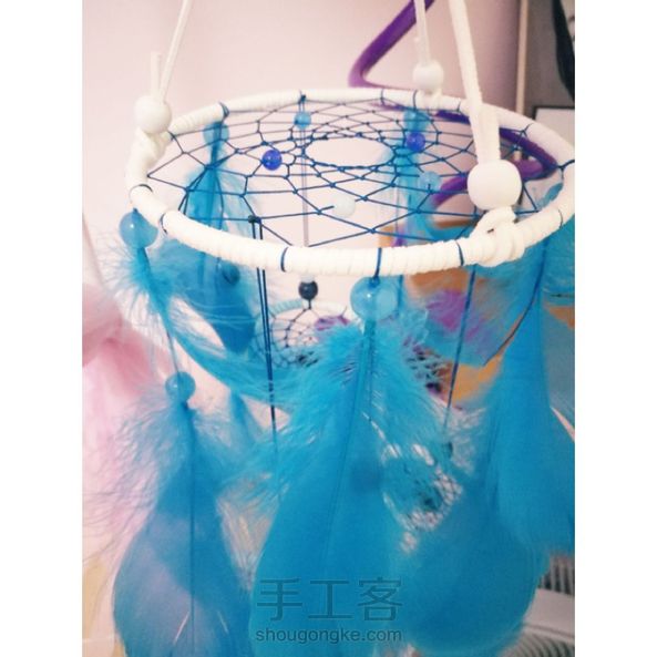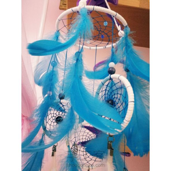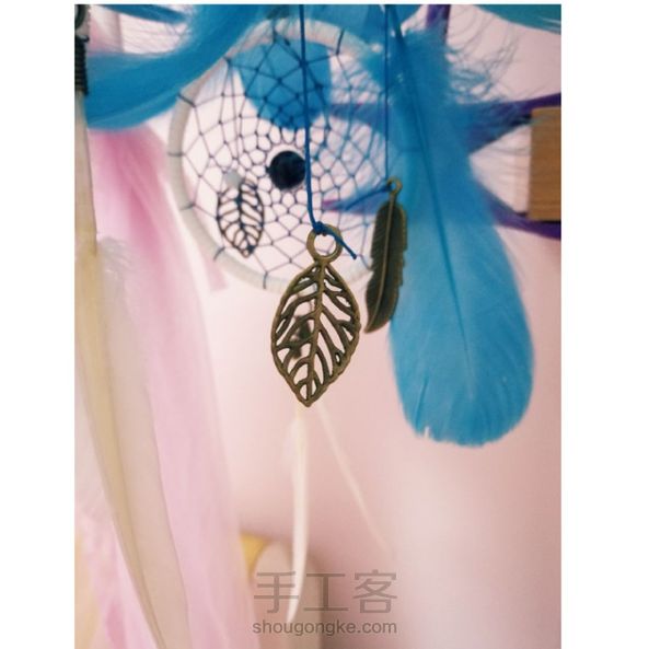 第一次做这样类型的捕梦网,下面挂的三个铁圈大小也不一样,一个纯色绕外线,另外两个由白色和蓝色搭配绕外线,再配有两根长羽毛,其实没有蓝色羽毛也很好看,这个看个人爱好,下面挂有五个不一样的铜饰,每一个细节都可以改进,又会有不一样的感觉。另外可以一起分享的是,用手机支架以后,制作更方便