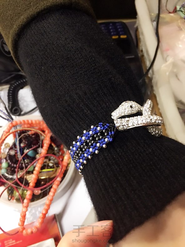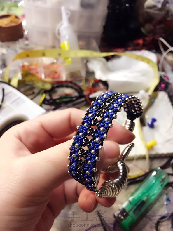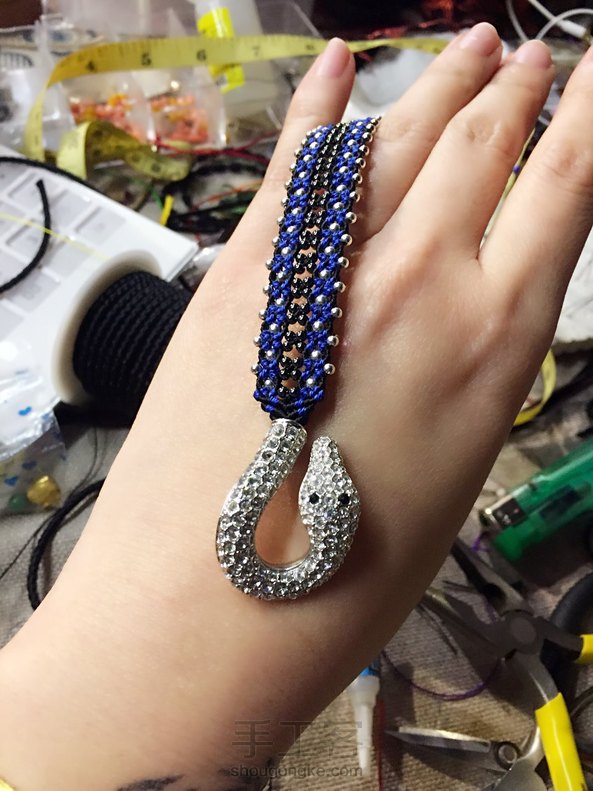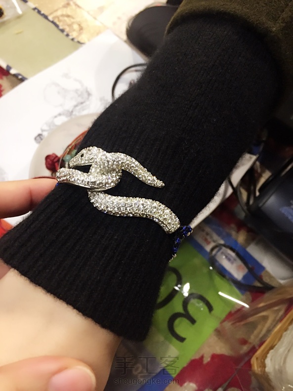 请忽略我的工作台,哈哈,我从不用蜡线,此乃股线,谢谢捧场!客人的一个施华洛世奇的扣子,我只想说绳是万能的!