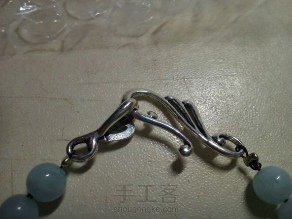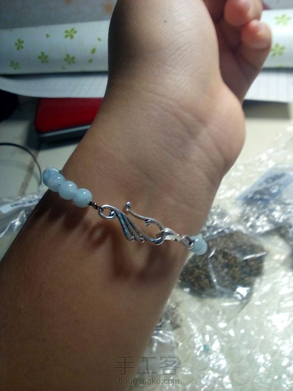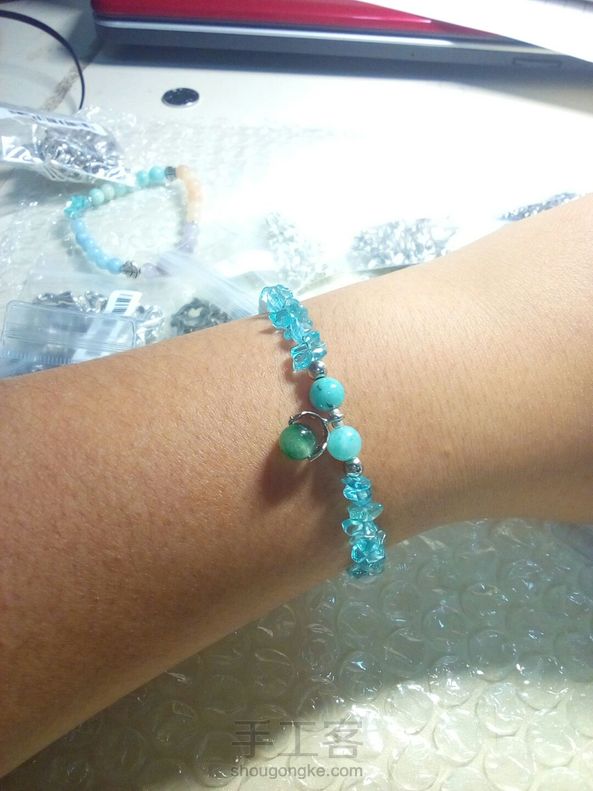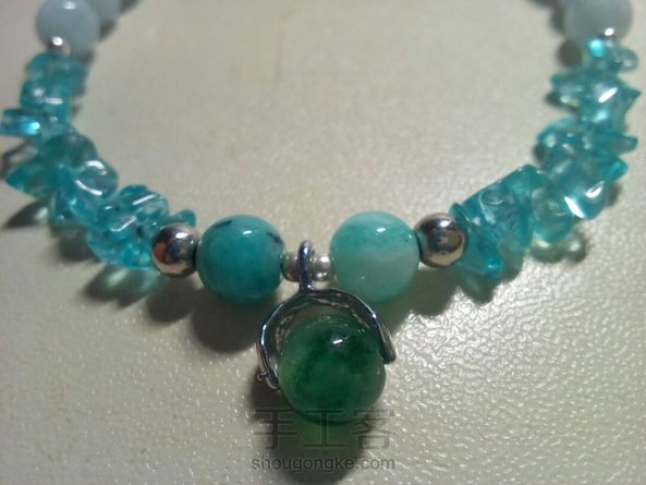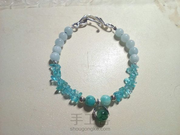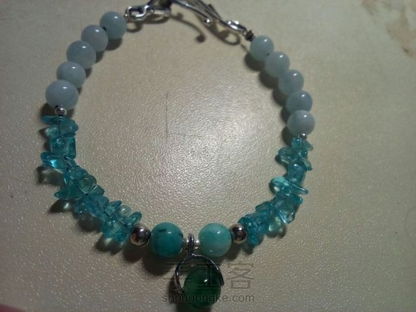 [水晶手链]用铁丝穿的,配上磷灰石碎石,海蓝宝和两颗天河石,总体呈蓝色调