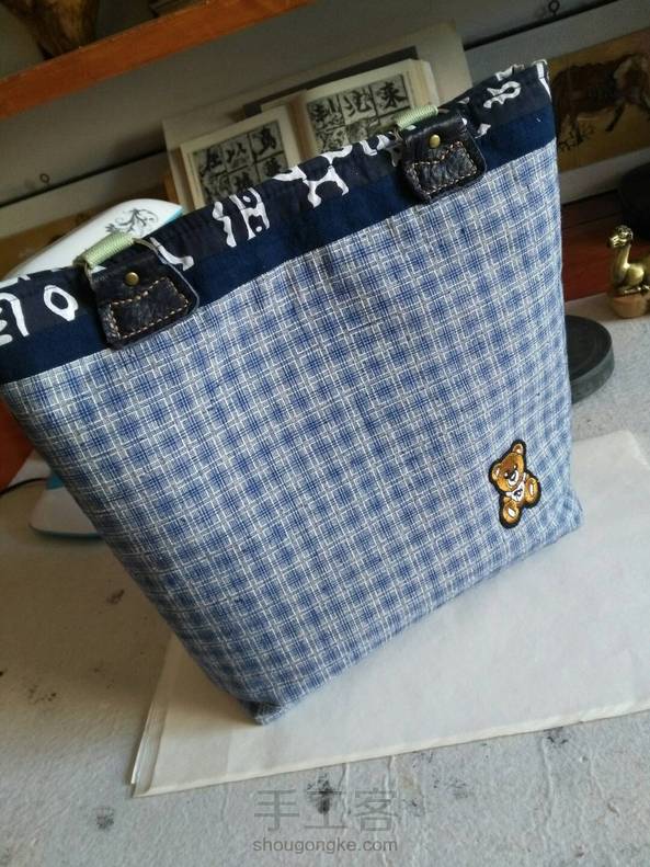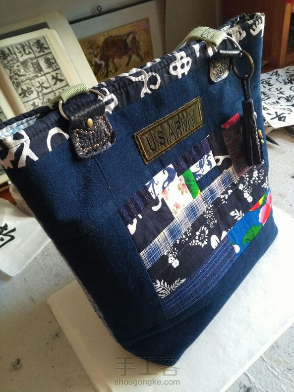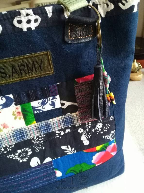 做的第二个包,比第一个大些,放A4大小的绰绰有余,上班时候装我的文件夹背来背去也很方便,图案是用碎布拼的,又加入了一些皮艺的元素,其实开始只是想包底用一块皮子,为了要皮子,不小心就又买了一套皮艺工具,只好硬着头皮做下去吧