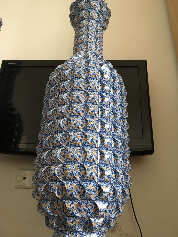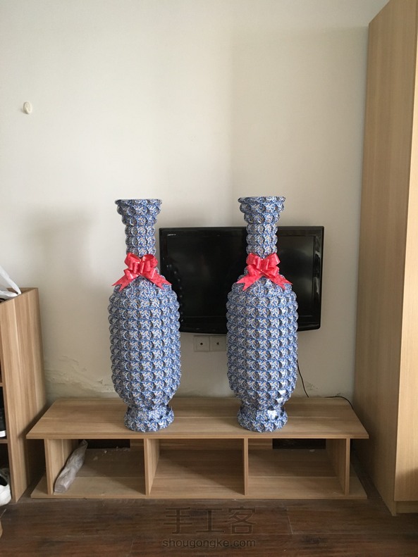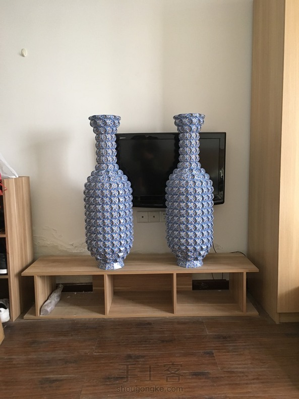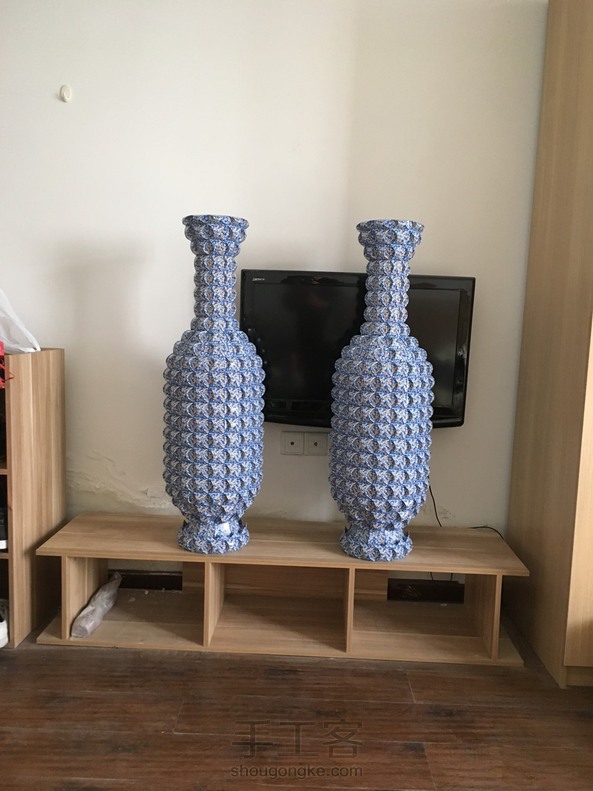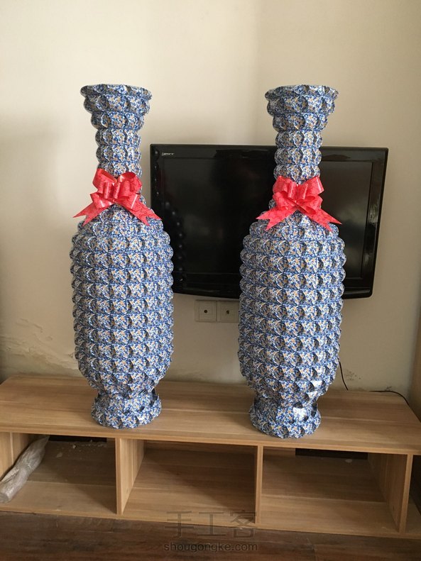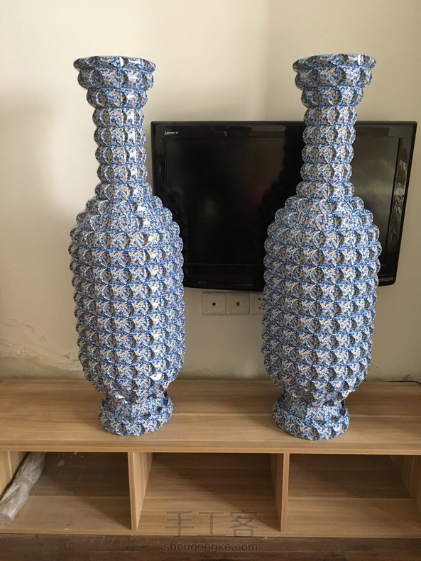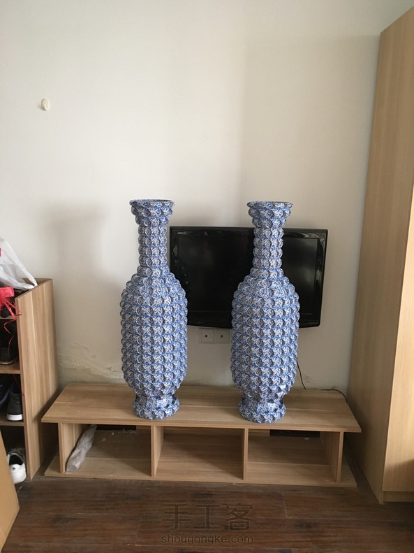 折好一对花瓶,高度刚好一米,折了我好几个月,用了三千多张共六十副扑克牌。