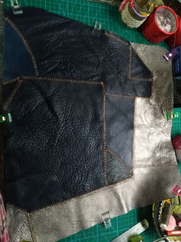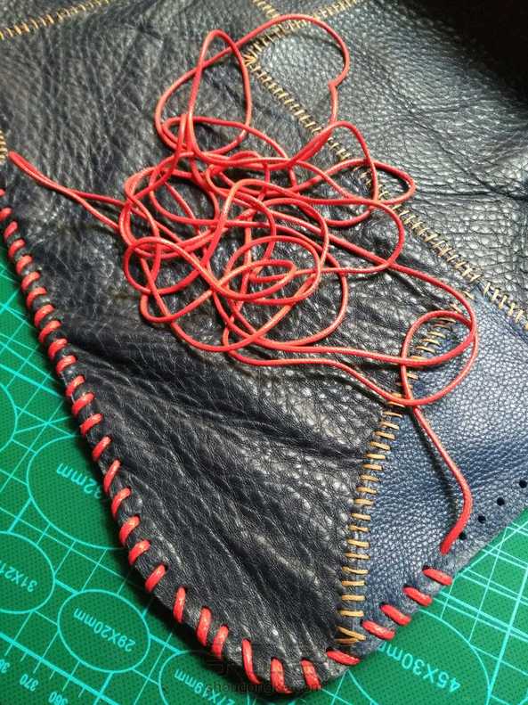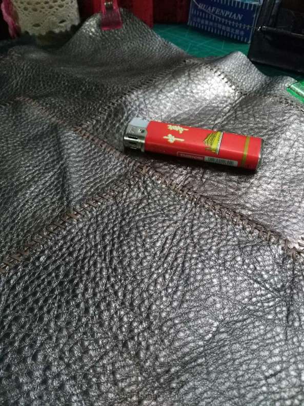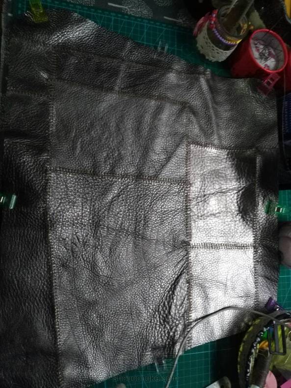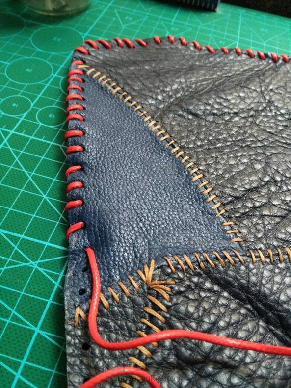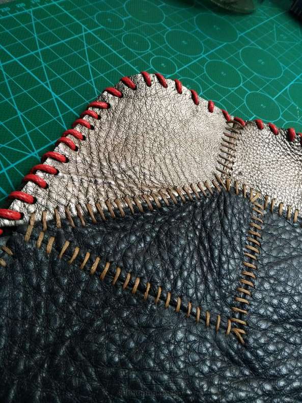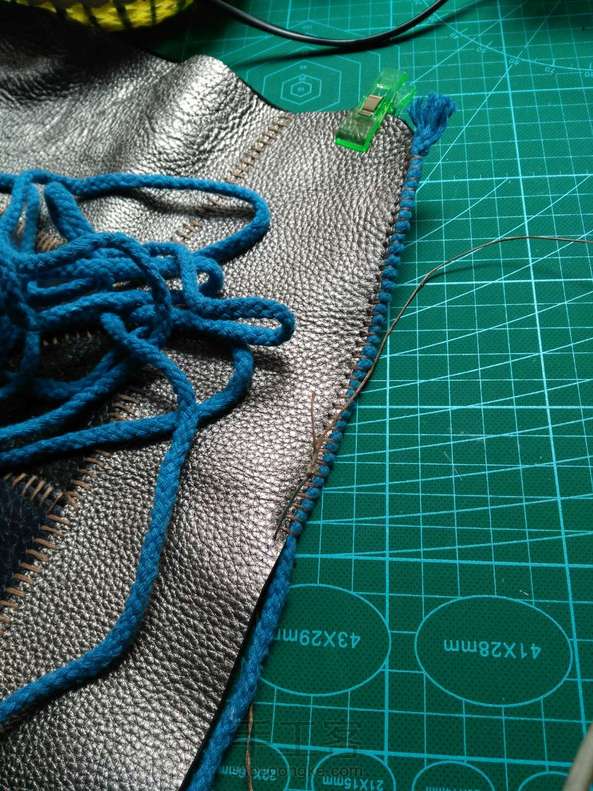 银色的是拼好的另一片,为了赶进度也为了省事没有再用胶,感觉这样也行,没什么影响。因为第一次做这个,心里也没谱,就按照预想的计划依次四边打斩,缝线,因为是二层厚,为了美观加了一条蓝色的棉的拉绳线做装饰,缝了一段后感觉太费劲有点后悔了,而且针也被我太使劲给弄断了,拆了返工,干脆就直接打孔,用之前买来编手链的比较粗的蜡线缝边,因为孔比较大这下穿起来倒是不怎么费劲了,现在也不管它好看不好看了,缝住就行,练手嘛,下一步该做垫芯了,要上班了,回来再做,未完待续。。。。。。。