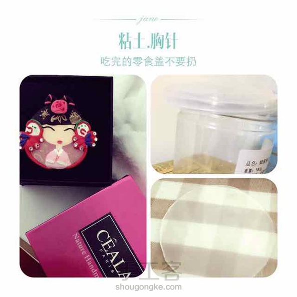 现在微信不是有很多卖罐装的零食嘛!然后剩下的罐子可以装杂物,盖子配上粘土可以做个胸针什么的,也算废物利用吧!