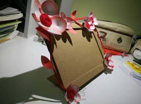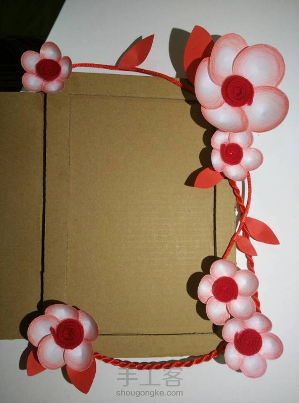 (不知道算不算纸艺?)立体装置设计作业…画底稿以后估大小,画圆涂圆(彩铅上圆形渐变真的好慢…),剪下来粘成立体,花心圆形粘毛线,纸板三层做相框底座,绳子做藤…感觉真心作死,想得太复杂,十节课都没做完,还好老师同意先打分数再交给他……
