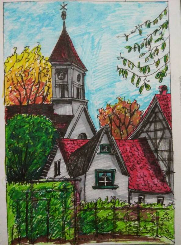 水彩笔画的风景,颜色艳丽了些。