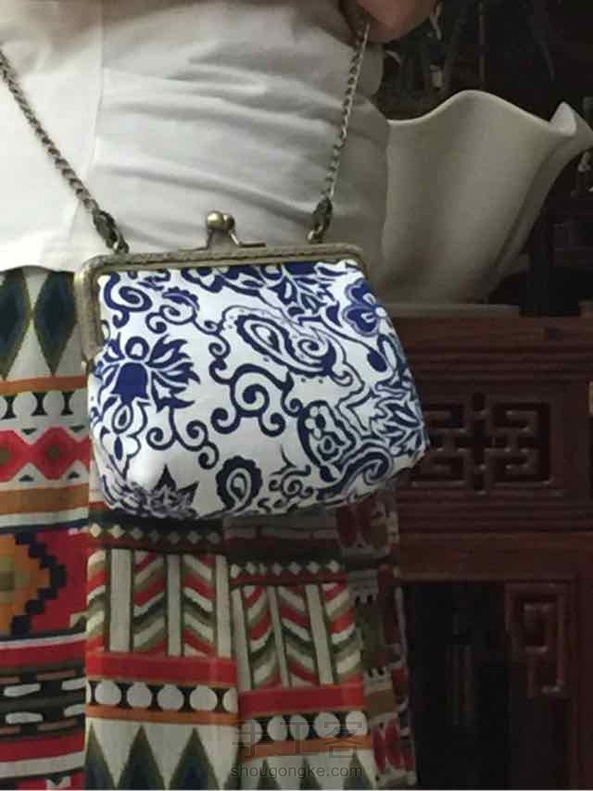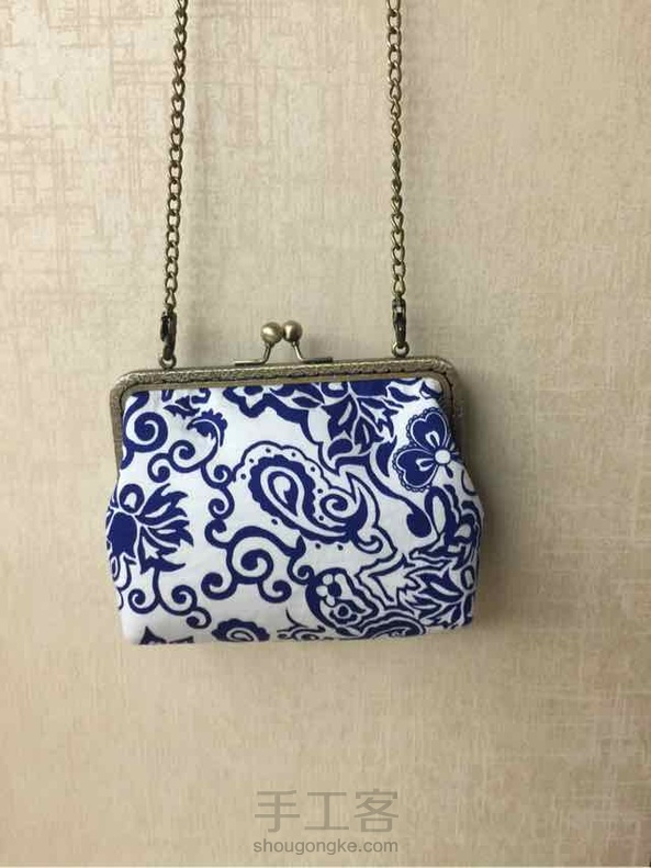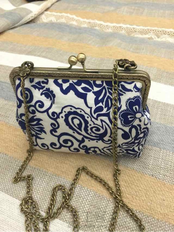 白底蓝花,很喜欢的一块布,做了15的方口(上次买了方口的辅棉),包体做好后等口金等了几天,今天中午到了,下班回家晚饭后迫不及待缝合口金,配上120铜色链子,终于有了一个可以背的包包了,但尺寸还是有点小,我的手机放不进,主要是包的宽度不够,下次想裁剪时放宽一点。