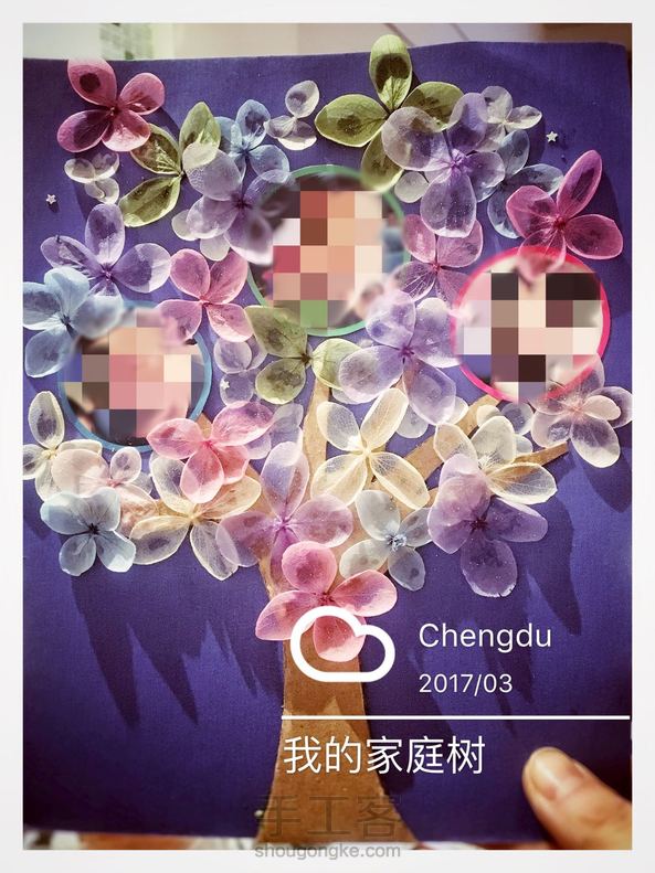 幼儿园老师布置的作业,要求做一幅【我的家庭树】……现在当父母也不容易,十八般武艺一样也不能少,奈何想法太多,自己给自己挖了个大坑……没办法,只有自己来填……树干是快递箱子剪的,花花全是用的以前做手工花剩下的绣球花瓣,可惜我家是男孩,理解不了自己娘的梦幻情节