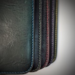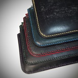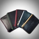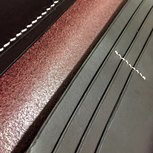 黑色外皮为英国JE马缰,蜜蜡色外皮为日本栎木植鞣,蓝色内皮为意大利鱼油肩皮,红色内皮为意大利Mbox软植鞣。