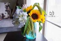 夏天的正确打开方式。向日葵五枝,雄尾四枝,浅紫色绣球花一枝。背后的帝王花只是暂时待着🤗